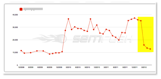 On this day, sites started to tank in masses. Everyone who had been doing "best practices" of SEO seemed to be hit and hit HARD! Below is only 1 screen shot of the dramatic devastation that occurred. I have many, but for the sake of space, I think you get the picture. Something was definitely wrong... across the board.