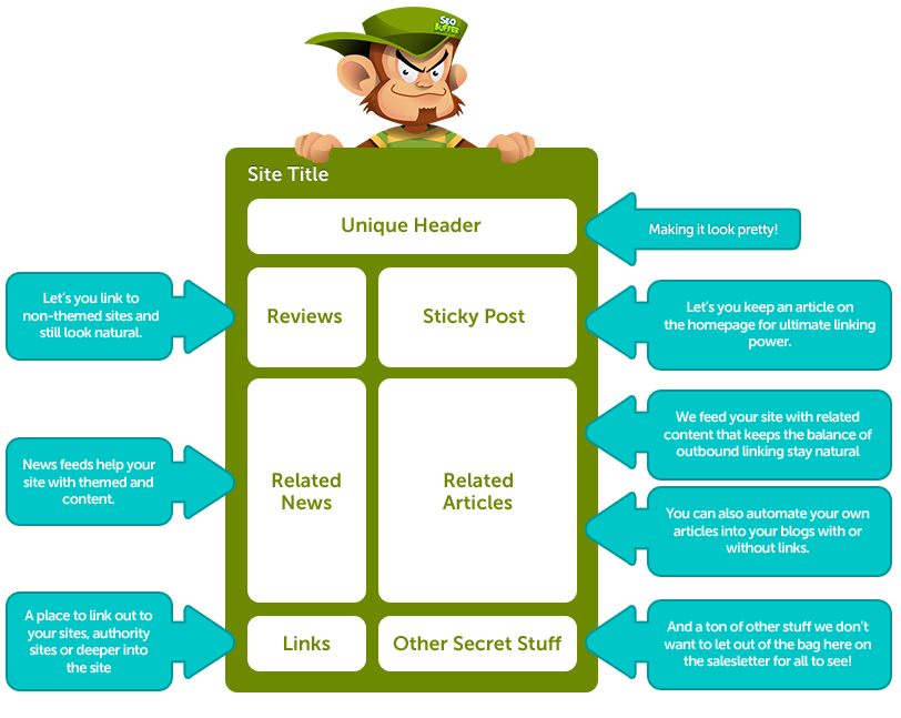 Every month you will receive aged, reputable, themed sites to add to your online arsenal. You will no longer be at the mercy of other webmasters, but in control of your own SEO.